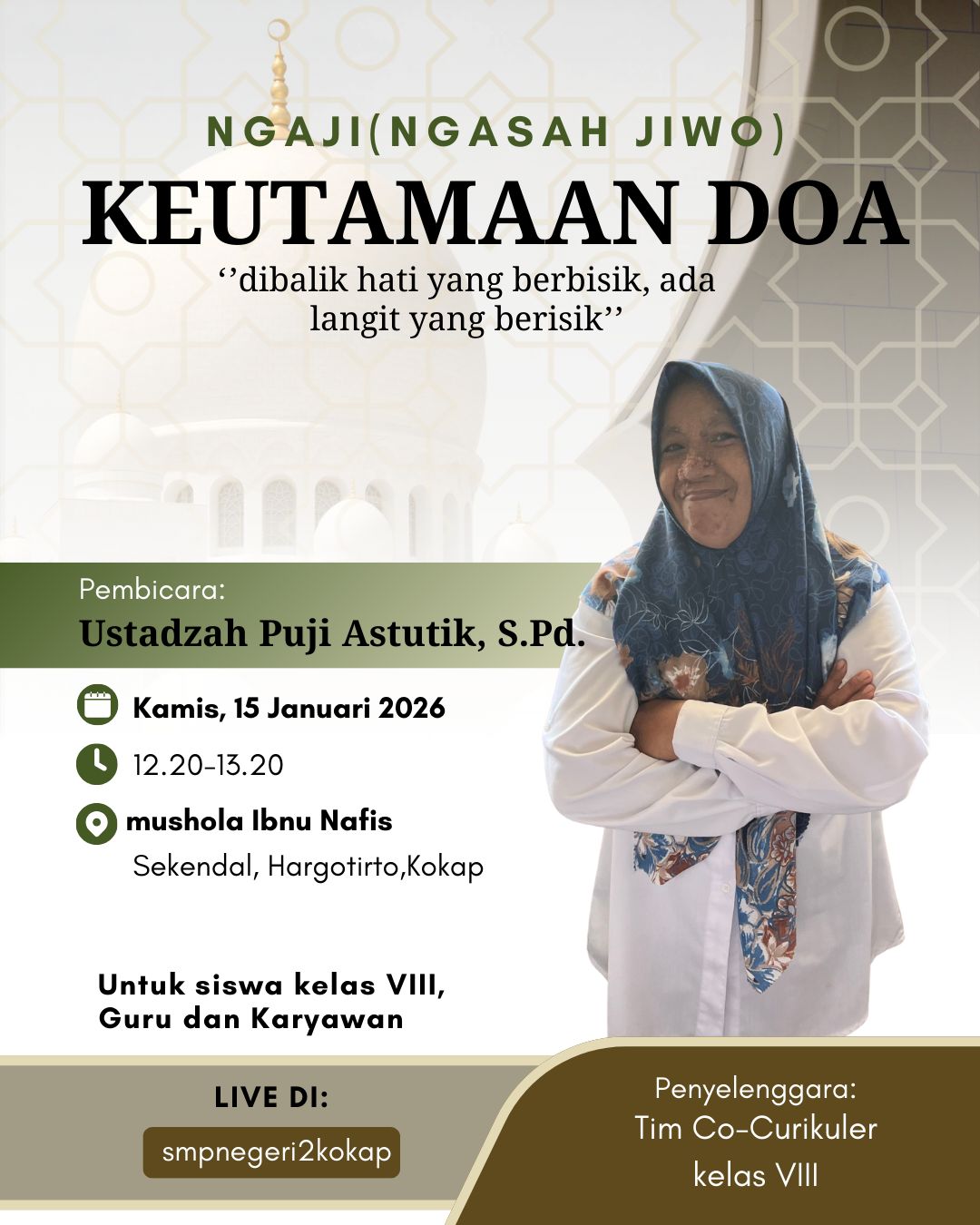 Dalam rangka menumbuhkan karakter religius serta meningkatkan pemahaman peserta didik terhadap nilai-nilai keagamaan, sekolah menyelenggarakan kegiatan co-kurikuler beribadah berupa pembuatan video doa-doa pendek. Kegiatan ini dirancang sebagai bentuk pembelajaran yang kontekstual, kreatif, dan sesuai dengan perkembangan teknologi digital yang dekat dengan kehidupan peserta didik.